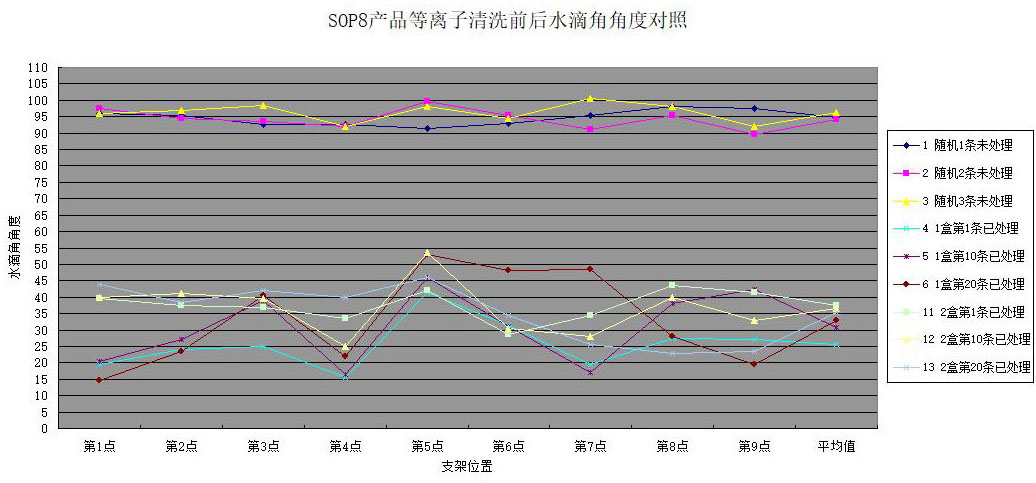 | 引线框架尺寸:238 mm×70mm | 等离子处理前:92.49° | 等离子处理后:37.5° |