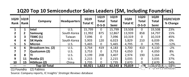 与去年同期相比,今年一季度有两个新成员进入前10名,分别是华为海思和英伟达,这两家公司取代了2019年同期英飞凌和Kioxia的位置。
