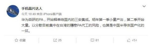 供应链消息人士手机晶片达人曝料称,华为研究开发的PA,开始释单给国內的三安集成。2020年第1季少量产出,第2季开始大量。以分散当前密集在台湾的穩懋PA代加工的风险,也算作中国半导体国产化的一个环节。
