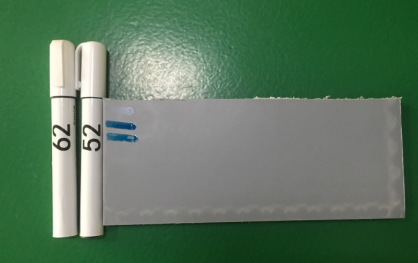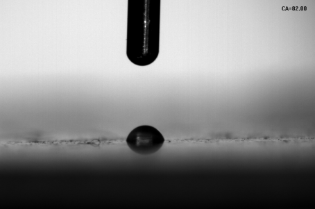 通过达因笔进行测试,可以看出此时62达因的达因液有些许收缩,材料表面达因值能够达到52达因。通过水滴角测量仪进行测试,得出该参数处理后的水滴角为48°。